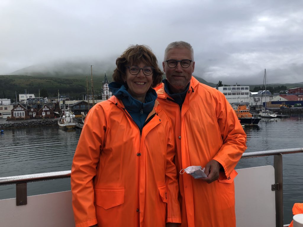 Vroeg opgestaan omdat we om 9 uur hadden afgesproken in Húsavík om de oceaan op te gaan om walvissen te spotten. Helaas regende het en de voorspellingen voor vandaag waren ook niet al te best. We kregen een mooie oranje (nee niet omdat we uit Holland kwamen) regenjas aan want omdat het windstil en niet koud was, was een overall niet nodig. Echt IJslands weer volgens de gids.