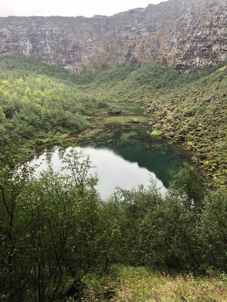 We hebben even boodschappen gedaan voor de lekkere trek onderweg en zijn toen naar Ásbyrgi gereden, een canyon in de vorm van een groot hoefijzer. De canyon is ontstaan door een overstroming na de uitbarsting van de vulkaan onder de Vatnajökull duizenden jaren geleden. Volgens anderen is hij gecreëerd door de god Óðinn die reed op zijn achtbenige hengst Sleipnir. Deze zette zijn hoeven neer en creëerde Ásbyrgi, vandaar de vorm van een hoefijzer. Wij geloven het allebei😉.