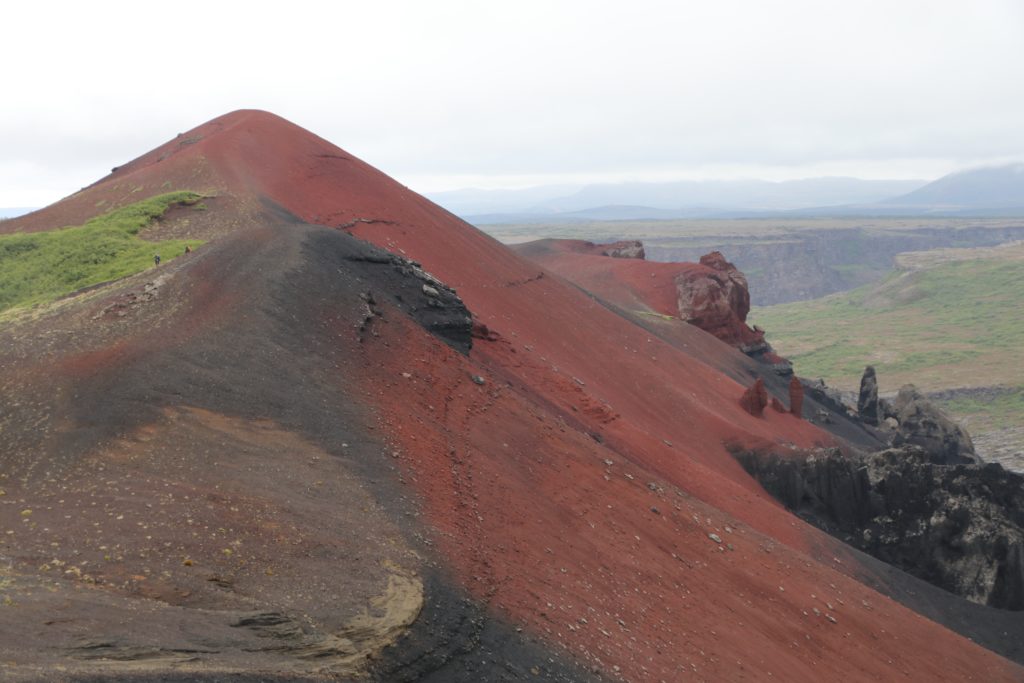 Hierna naar de Hljóðaklettar (onuitspreekbaar), een tip van Joost en Hannastina, takk fyrir ábendinguna oftewel bedankt voor de tip 🤣. Het is een vulkanisch gebied wat ontdekt is in 2009. Het gebied staat vol basaltrotsen en is gevormd door de lava van de vulkaan Rauðhólar. We hadden de bewegwijzering gevolgd om er te komen met de auto maar opeens stond er geen bordje meer. Een hele nieuwe weg vol bochten slingerde naar boven en daar was een heel nieuw parkeerterrein aangelegd. We vroegen ons af of ze dit bedoeld hadden. Toch maar begonnen aan de wandeling. Het eerste gedeelte liep over een goed pad tussen mooie heide en andere kleine kruipertjes. Toen zagen we een bordje naar de vulkaan Raudhólar. Dat pad gevolgd en toen zagen we hem liggen en konden we een eind erop lopen. Werkelijk adembenemend, die rode kleur, wat prachtig!