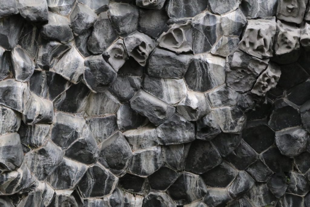 Maar er was ook nog een wegwijzer met die moeilijke naam. Daar wilden we toch ook nog naar toe. Soms een beetje eng voor iemand met hoogtevrees. We liepen nu tussen de basaltrotsen, iedere rots was anders, rotsen met bijzondere vormen, zeshoeken, spiralen, etc. Dit fenomeen wordt veroorzaakt door de samentrekking van het gesteente door het afkoelingsproces van de hete lava. Je blijft kijken naar alle bijzondere vormen.