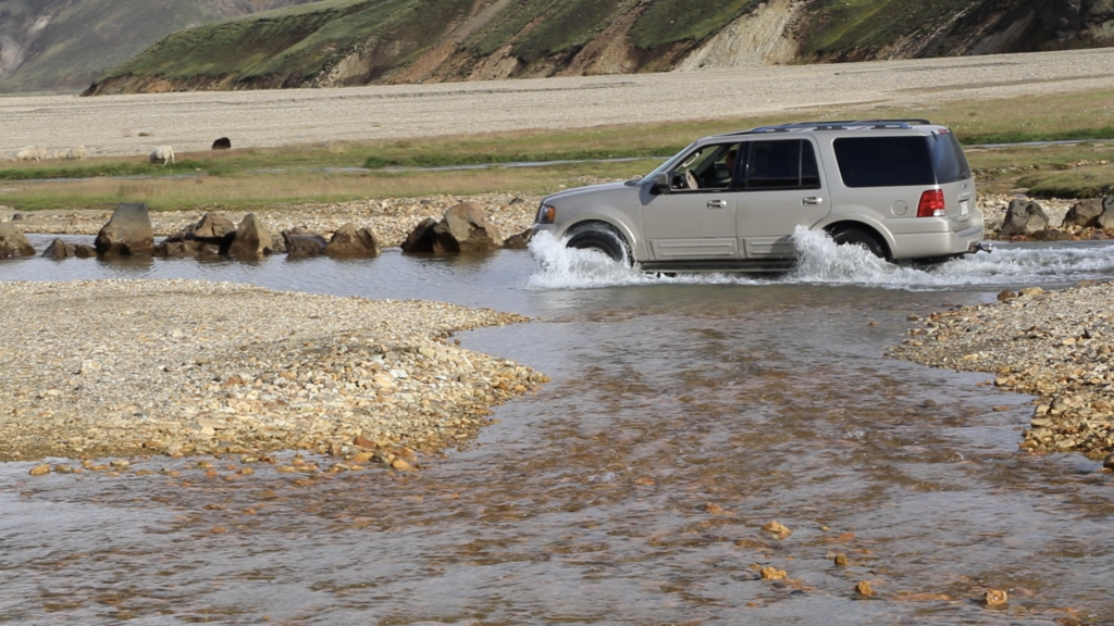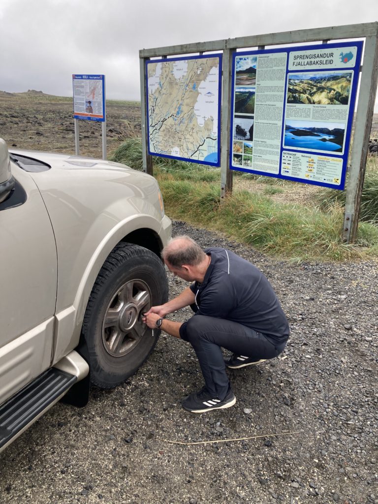 Daarna de auto van Joost ingepakt voor de reis naar Landmannalaugur. Met onze huurauto is het verboden om F wegen te nemen, laat staan door water te rijden. De hele weg was het mistig en miezerig. Maar de weersvoorspellingen hadden beloofd dat de zon rond 12 uur zou komen. En wat treft onze verbazing, na een paar uur rijden verscheen de zon. Onderweg de banden een beetje leger laten lopen, dat rijdt lekkerder over de ‘wasbord’weggetjes. De rivieren waren voor Joost natuurlijk geen probleem.