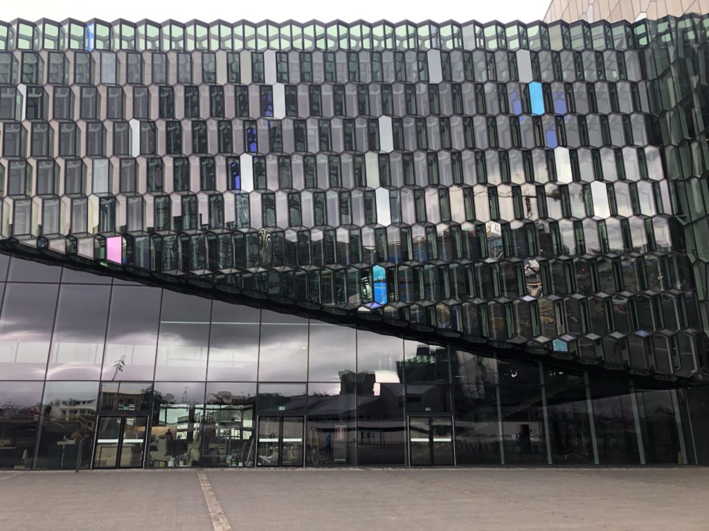 Gewandeld naar de haven, naar Harpa. Het Concertgebouw, een modern gebouw met heel veel glas.