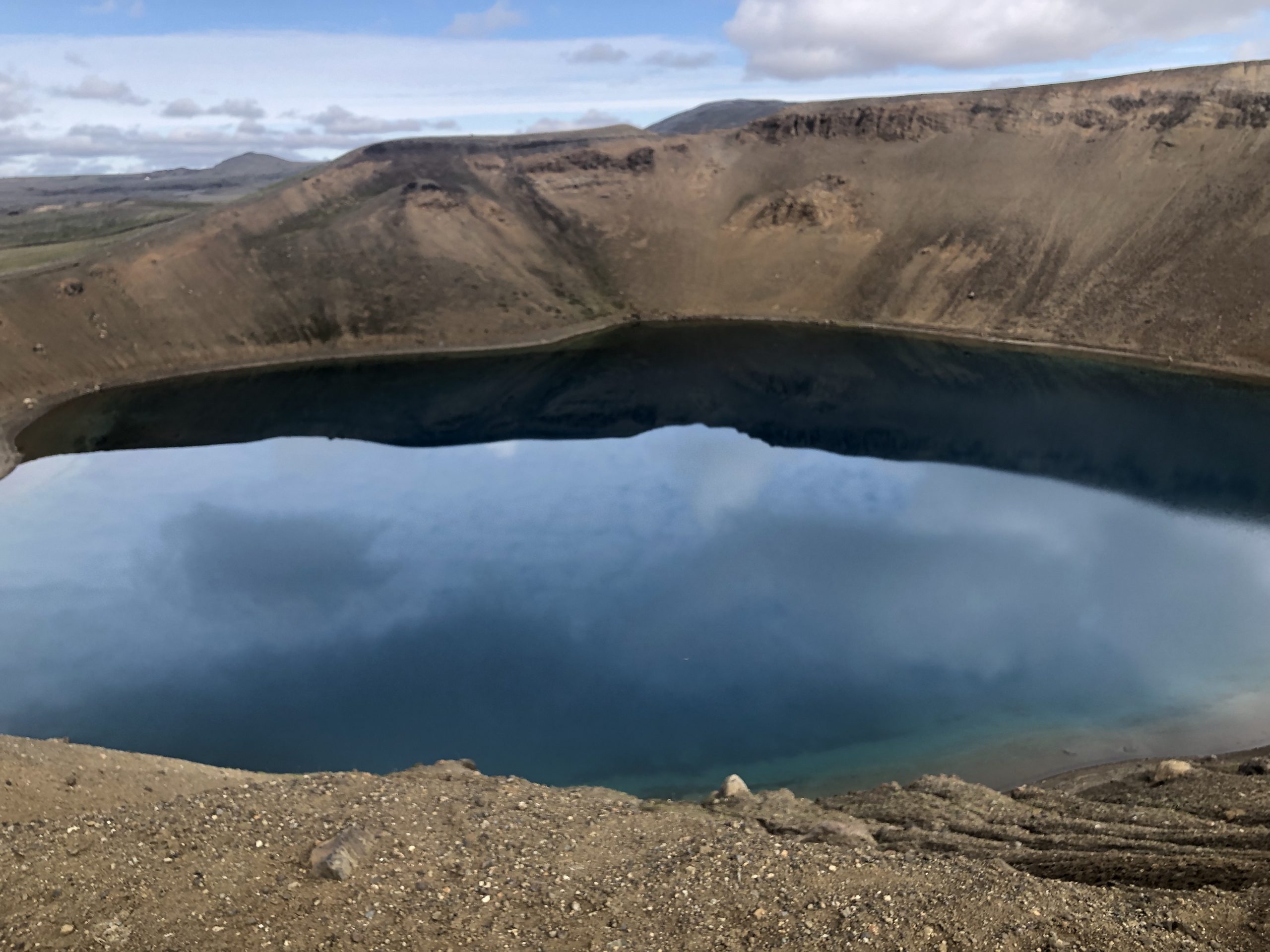 Na deze watervallen zijn we terug gereden naar Krafla. Krafla is een 818 m hoge vulkaan ten noordoosten van Mývatn. Eerst naar de krater Viti gelopen. Was vrij stijl maar goed te doen. Prachtig blauw water en een mooie blauwe lucht. Wat wil je nog meer?