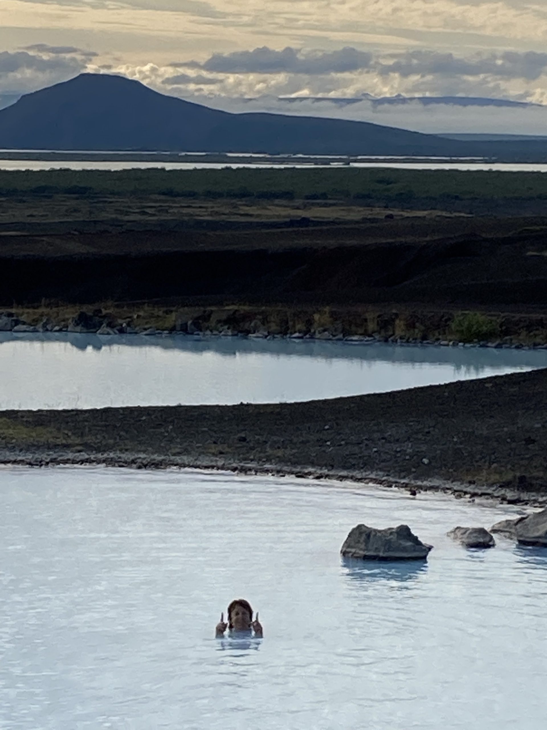 Na alle uitstapjes van afgelopen week vanmiddag een paar uur gerelaxt in Myvatn Nature Baths, een soort Blue Lagoon maar minder toeristisch. De temperatuur van het water was tussen de 38 en 41 graden. Onze badkleding stinkt nu wel.
