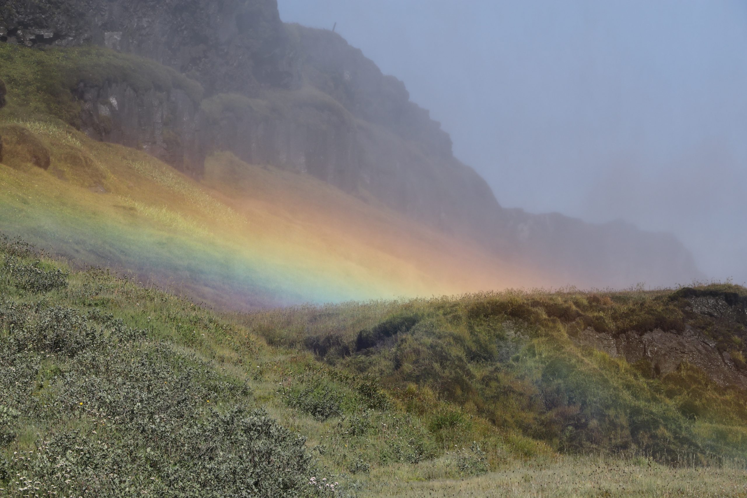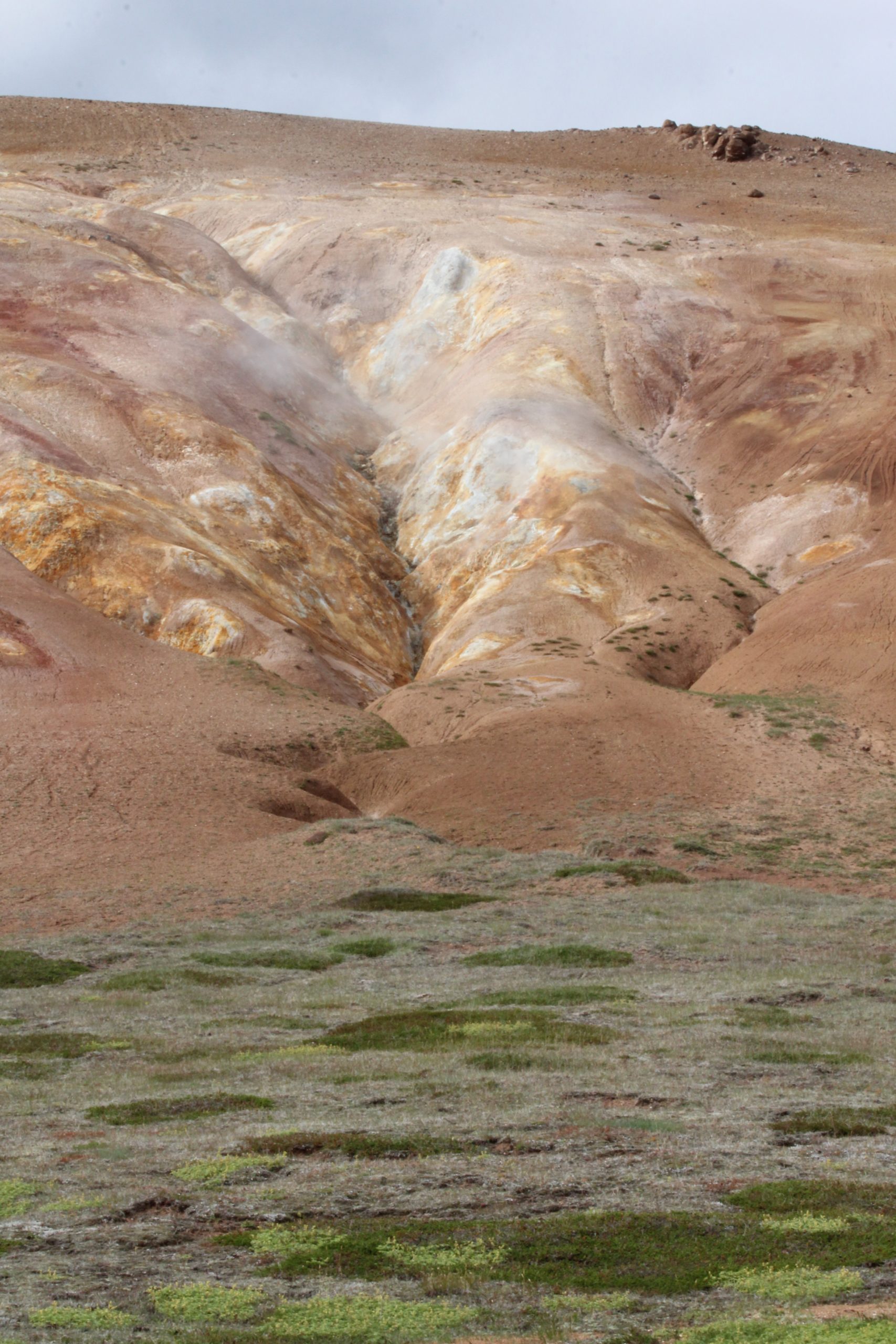 Het gebied rond de Krafla is de afgelopen eeuwen meerdere keren actief geweest. Tussen 1975 en 1984 waren er een aantal aardbevingen. Tijdens 9 uitbarstingen ontstond er een kloof van ongeveer 7,5 kilometer, en de lava die hieruit kwam is nu nog aan het roken. Aparte ervaring om hier doorheen te lopen. Ook loop je weer langs kokende modderpoelen en mooi gekleurde aarde. Op sommige plekken groeien ook weer verschillende bloemetjes. Oe kant zo groeie😀