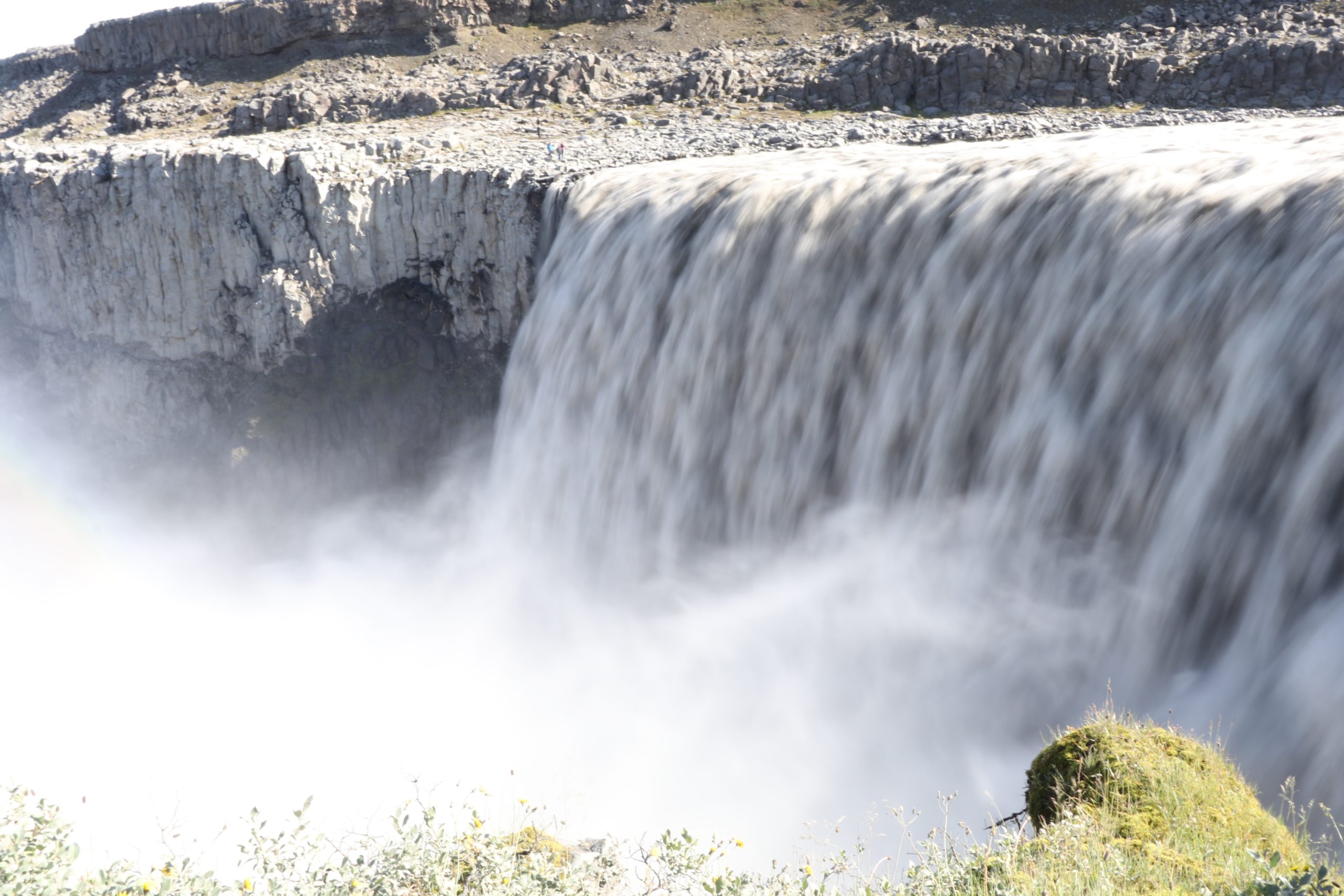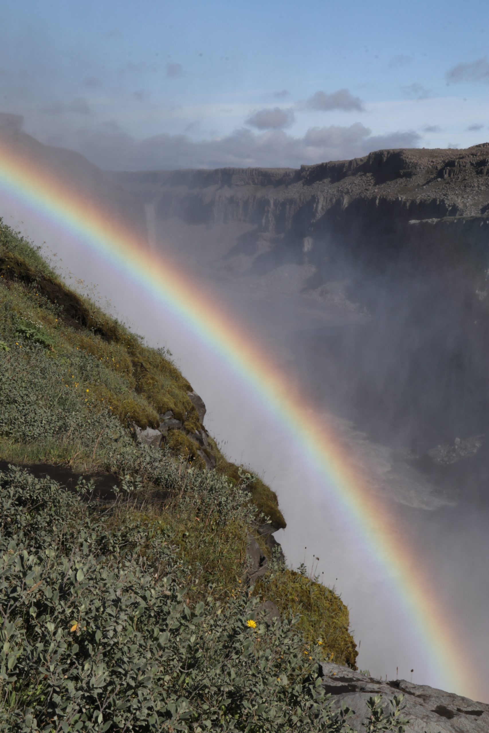 De rivier Jökulsá á Fjöllum voert jaarlijks zo’n 5 miljoen ton klei naar zee. Vandaag was de waterval extra mooi doordat de zon een mooie regenboog maakte.